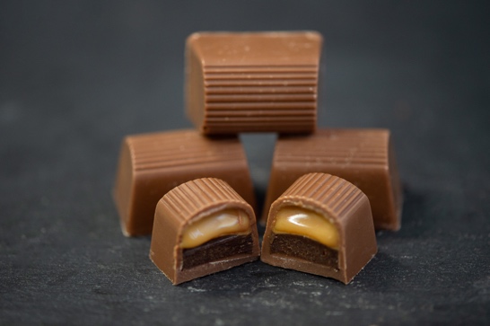 Sűrű karamell és kávé krémmel töltött bonbon (tej, szója)